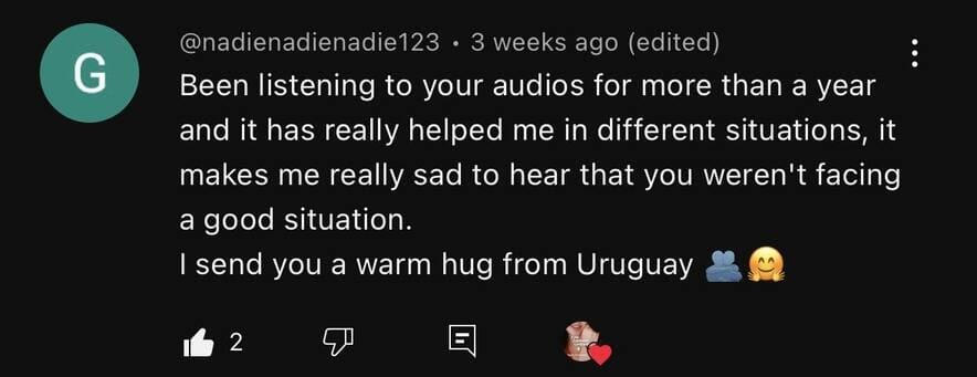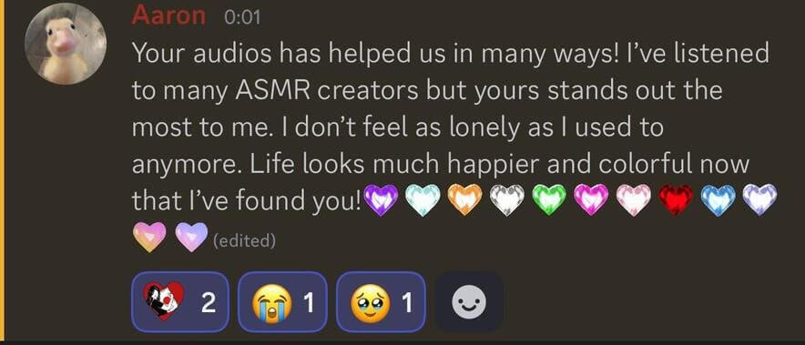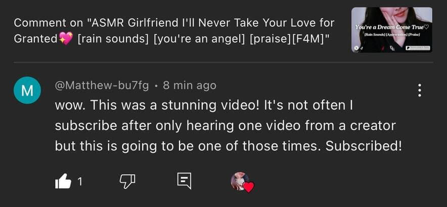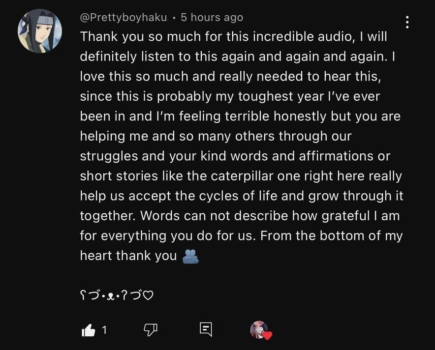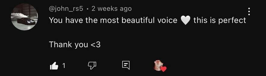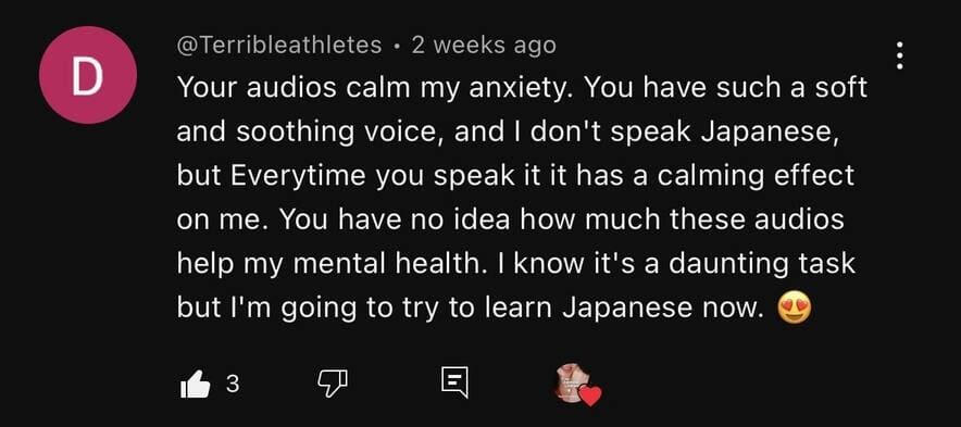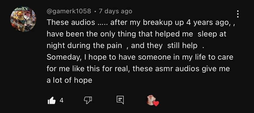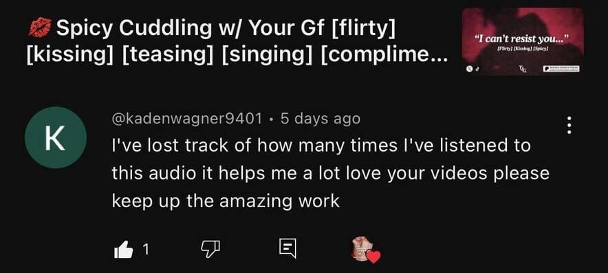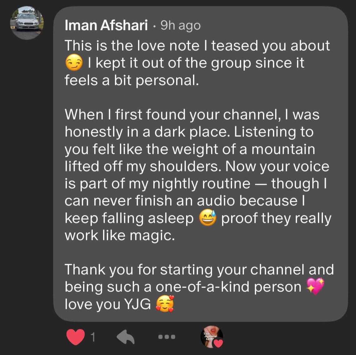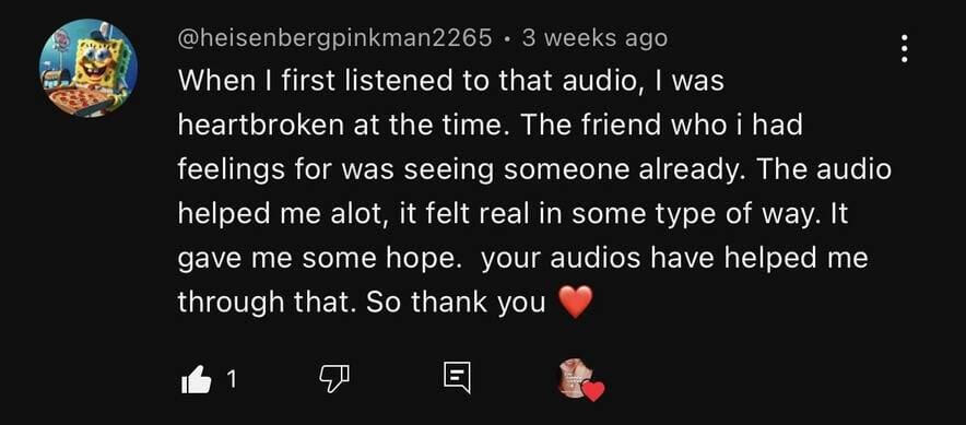 I first began creating audios on YouTube as a way to cope with heartbreak. While recording, I imagined myself in my dream relationship: built on love, kindness, and being cherished for who I truly am.I never expected that my words and voice would touch so many hearts around the world. My listeners began sharing that my audios helped heal their hearts and helped them sleep better, made them feel less lonely and more confident, and reminded them that the love they long for really does exist.From my very first Youtube video in September of 2024 until now, this journey has been such a gift. My listeners remind me every day that I am valuable and unique, and I hope my audios remind them of the same truth about themselves.I am endlessly grateful for this community, and I hope to continue using my voice to bring comfort, healing, and joy to anyone who needs it.Love,
