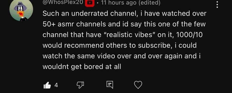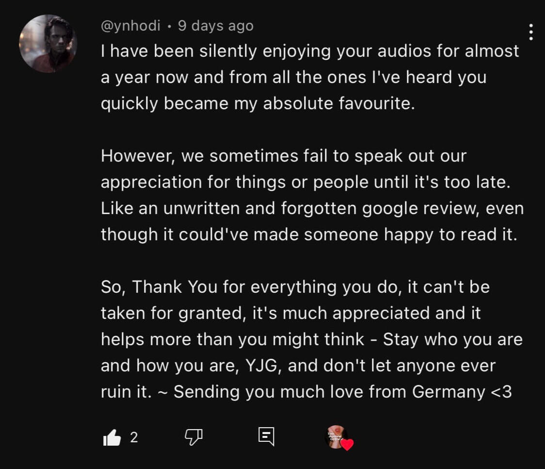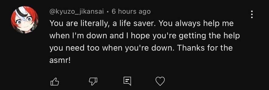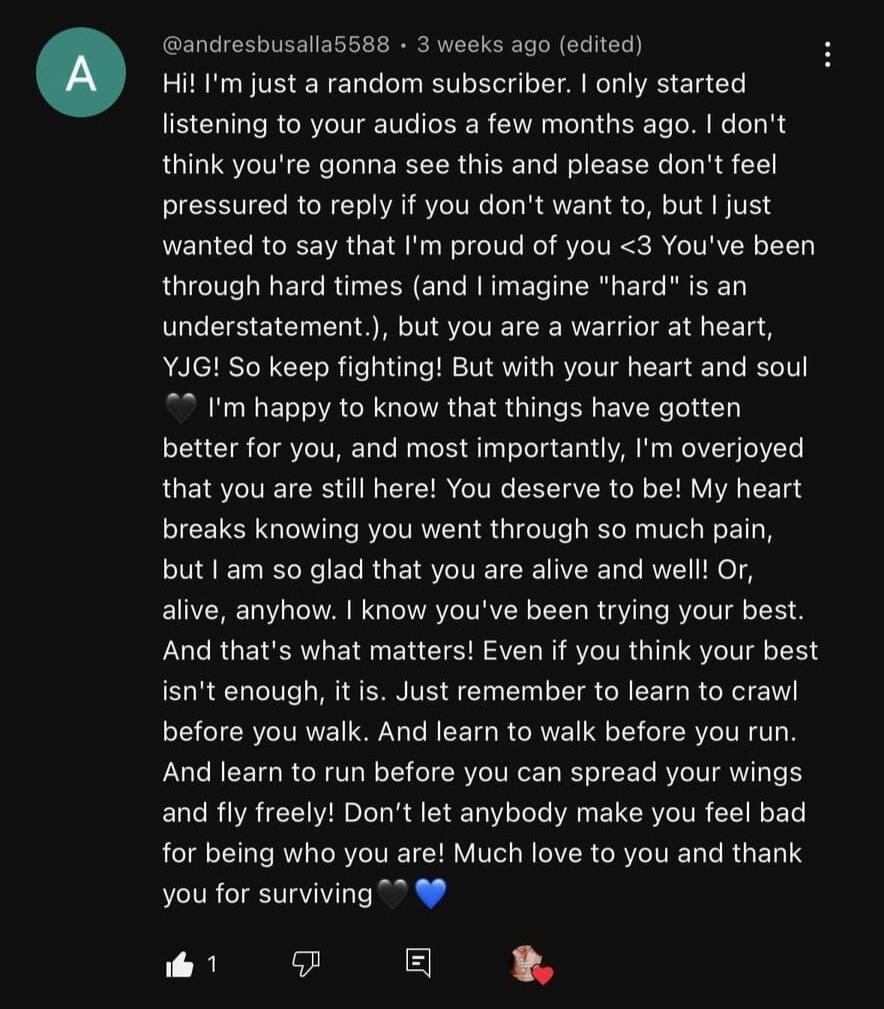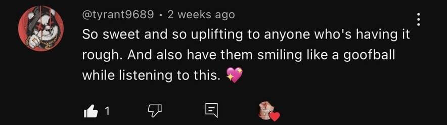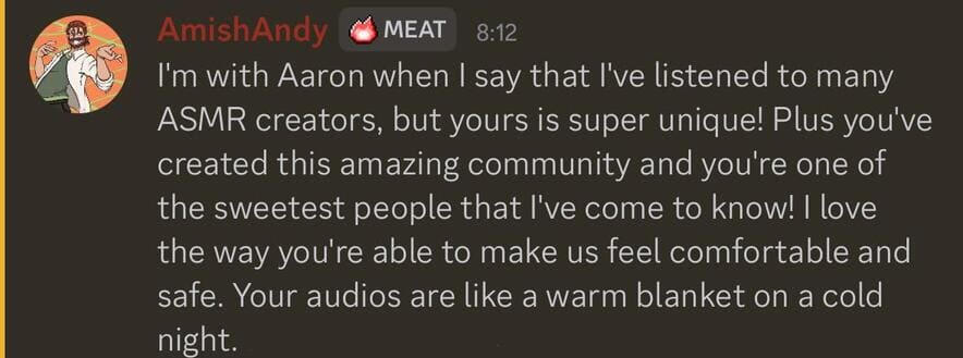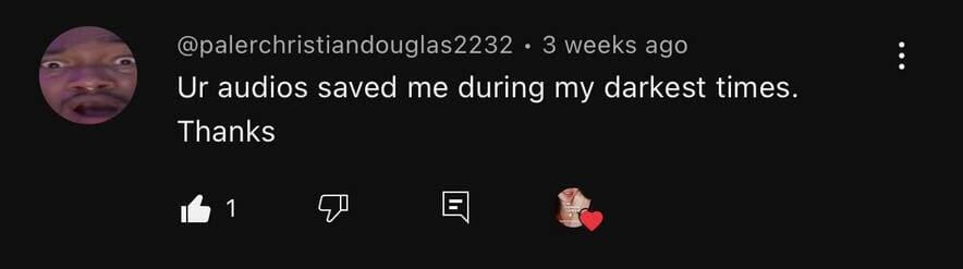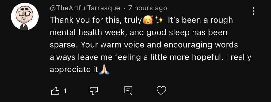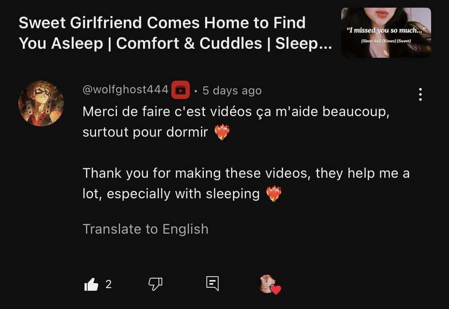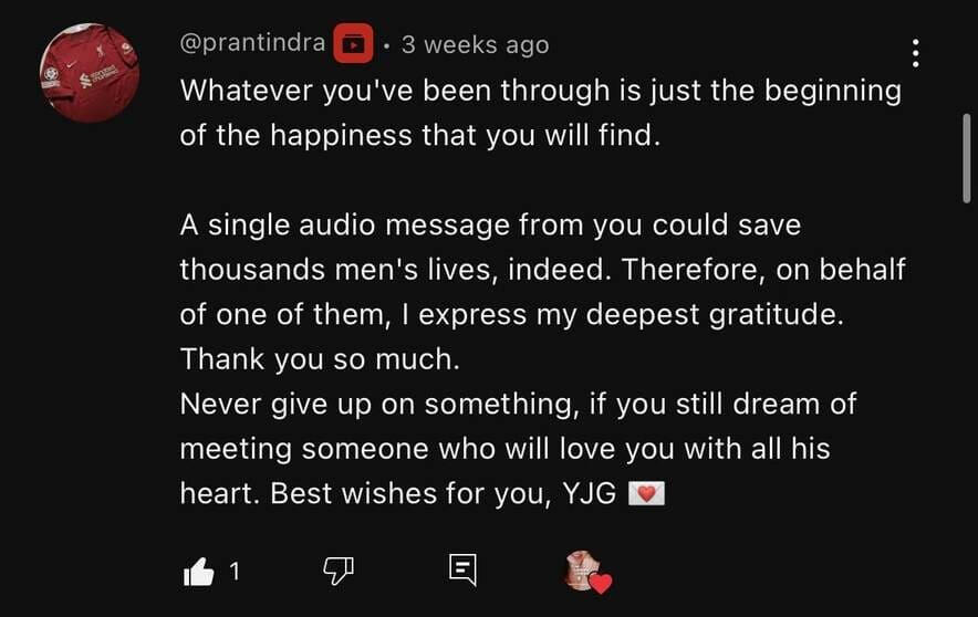 I first began creating audios on YouTube as a way to cope with heartbreak. While recording, I imagined myself in my dream relationship: built on love, kindness, and being cherished for who I truly am.I never expected that my words and voice would touch so many hearts around the world. My listeners began sharing that my audios helped heal their hearts and helped them sleep better, made them feel less lonely and more confident, and reminded them that the love they long for really does exist.From my very first Youtube video in September of 2024 until now, this journey has been such a gift. My listeners remind me every day that I am valuable and unique, and I hope my audios remind them of the same truth about themselves.I am endlessly grateful for this community, and I hope to continue using my voice to bring comfort, healing, and joy to anyone who needs it.Love,